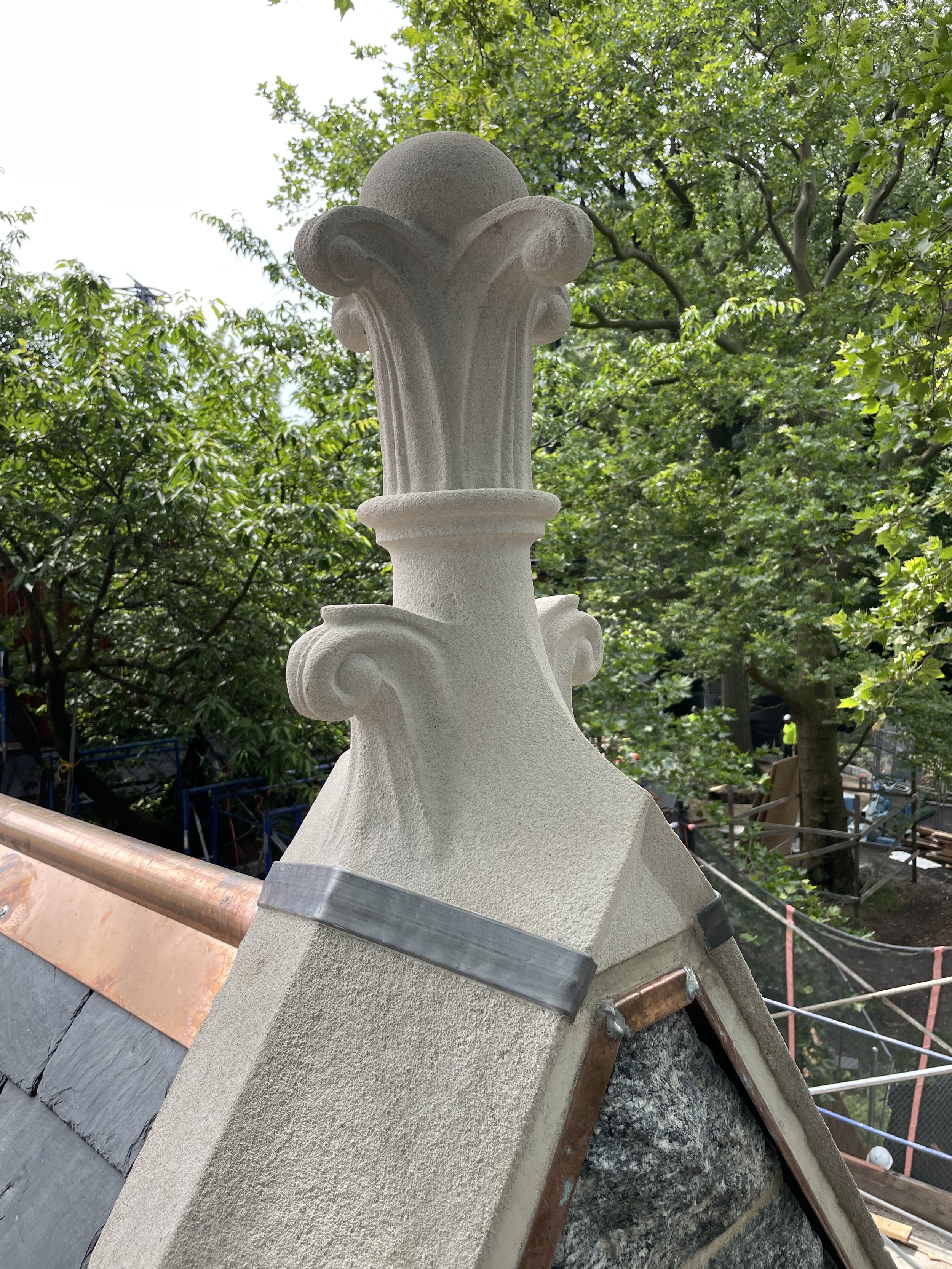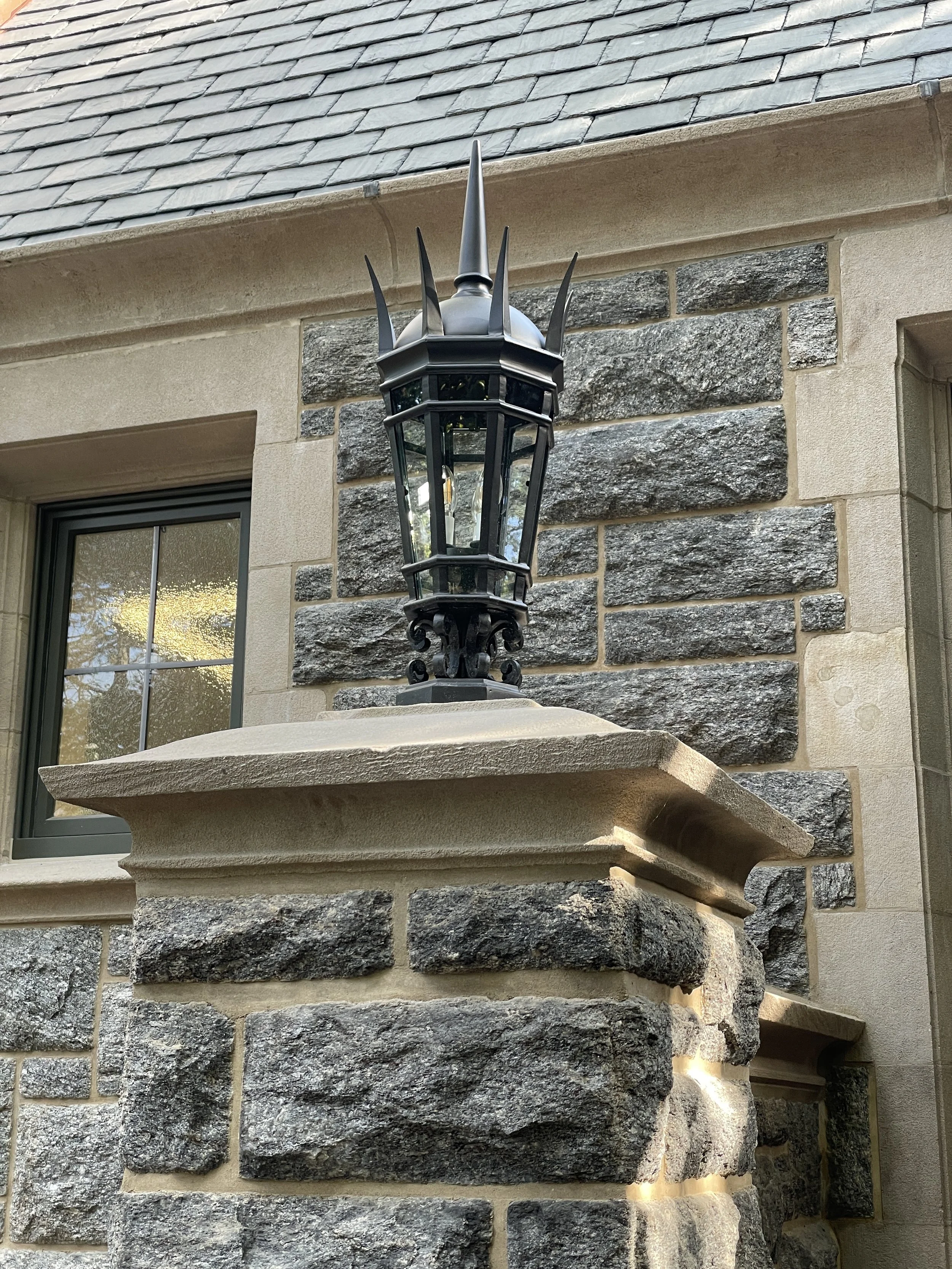 Li/Saltzman Architects, as the Preservation Architect, provided archival research, assessed the exterior envelope, and established a scope of restorative work to return the building to sound condition, restore its historic integrity, and meet LPC regulatory requirements. The restorative scope included facade cleaning with Rotec micro-abrasive system; re-creation of missing original limestone window enframements and gable finials; repointing and selective repairs of masonry; new windows and doors recalling the historic configuration and detail; new copper gutters, internal leaders, and flashing; slate roof replacement; and new light fixtures based on the original design. The project was completed in 2025.